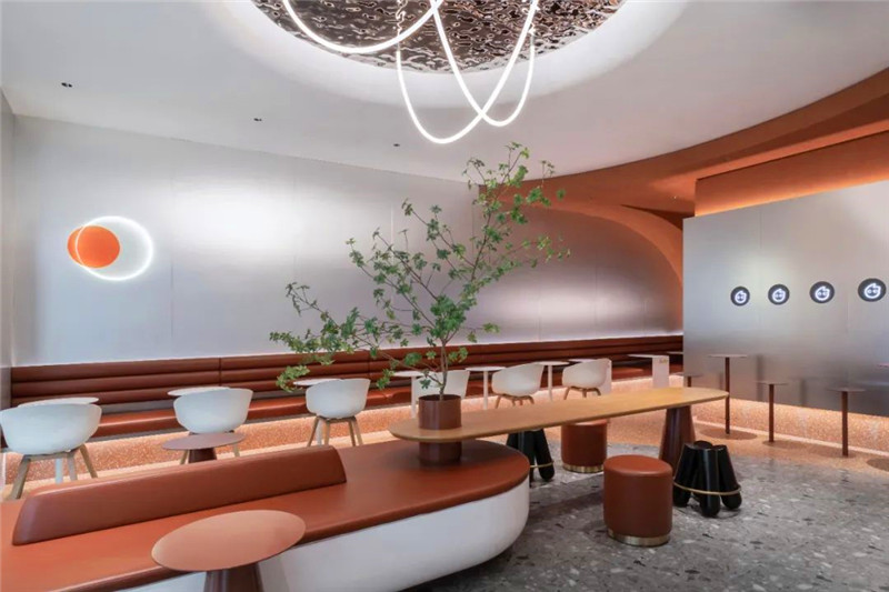 CoCo都可九江九方店空間設(shè)計不同方向的弧線讓空間創(chuàng)造了多變的視覺效果,顧客從進店點單,到就坐或離開,隨視線與位置的移動,能感受到空間面貌的變化,有如游山時的移步易景。詮釋了宋代文學家蘇軾描寫廬山之美的經(jīng)典詩句:“橫看成嶺側(cè)成峰,遠近高低各不同,不識廬山真面目,只緣身在此山中?!?