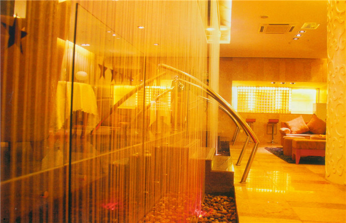 二層設(shè)有會(huì)議室、宴會(huì)廳及包房。大會(huì)議室的天花造型美觀實(shí)用,墻面通過(guò)木飾分格造型巧妙隱藏了各個(gè)出口和入口。在宴會(huì)廳,由于鏡面的反射,墻面?;u噴砂圖案與一層大堂構(gòu)成呼應(yīng)。酒店客房設(shè)計(jì)除滿足商務(wù)功能外,簡(jiǎn)潔中卻又有微妙的細(xì)節(jié)變化,通過(guò)對(duì)選材、造型尺度、家具及配飾的精心設(shè)計(jì),凸顯其在當(dāng)?shù)氐念I(lǐng)先地位。