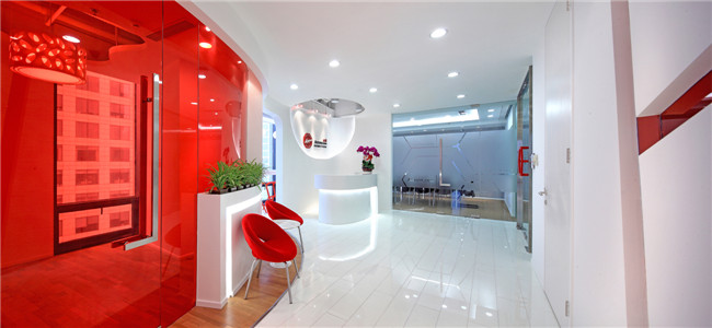 在這個不大的辦公空間里,設(shè)計師將前廳、等候區(qū)的墻面設(shè)計成一條有趣的曲線,將VIP體驗區(qū)與入口貫穿在一起,形成紅白相間的舞動長廊。這種連續(xù)的流線型墻壁是將接待臺、LOGO板、洽談吧臺、休息區(qū)洞口、經(jīng)理室墻面等組織在一起的。