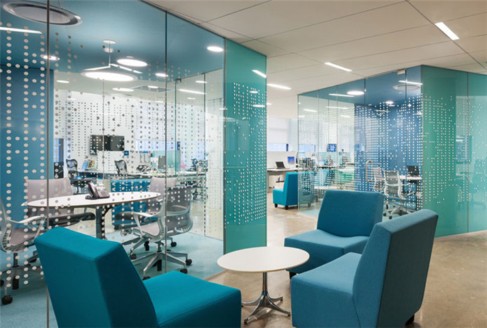 曼哈頓辦公室入口設(shè)計就別樣新奇,入口相對比較低矮,一旦從這進去,就有一種柳暗花明的感覺,中央大廳明亮寬敞,落落大方的展現(xiàn)在眼前。大廳以半透明碟片屏幕墻進行裝飾,以藍色窗簾襯底,強化了空間效果。