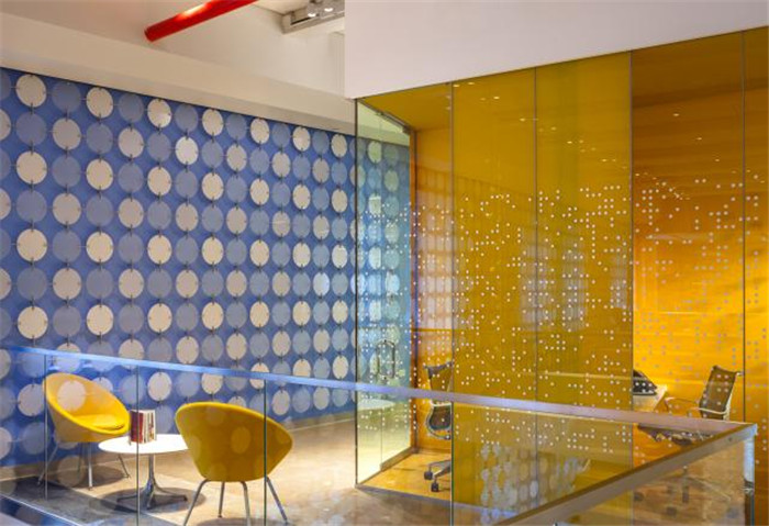 開放式辦公區(qū)域,顏色各異,私密會議室由原點裝飾的玻璃隔間形成。室內(nèi)墻壁藝術(shù)風(fēng)格很濃,抽象的空間設(shè)計創(chuàng)造造出不同的視覺效果。室內(nèi)空間也在很大程度上反應(yīng)這建筑的歷史文化,比如木質(zhì)階梯。