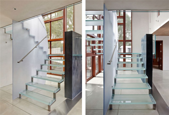 設(shè)計(jì)師們還在別墅中央設(shè)計(jì)了獨(dú)特的、獨(dú)立玻璃臺(tái)階連接別墅的上下兩層。室內(nèi)白色水泥墻面為別墅增加了明亮的光線。鍍鋅屋頂和定做的木窗將室內(nèi)裝飾很有特點(diǎn)。天然石材,混凝土,石膏,青銅,深色硬木材等材料構(gòu)成了整個(gè)別墅建筑,和諧地共存。別墅室內(nèi)裝飾的細(xì)節(jié)也同樣精彩。