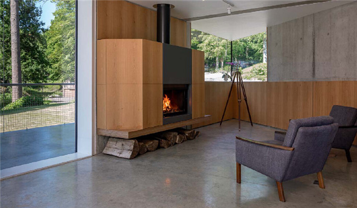 整棟建筑為混凝土結(jié)構(gòu),三個(gè)外立面采用木材包裹,以形成“森林屋”的溫暖氣質(zhì)。剩下的緊鄰車道的外立面則覆蓋著耐候鋼板,氧化的銹紅色表面與周圍樹木相呼應(yīng),散發(fā)著秋天的婉約氣息。別墅建筑整體并無太多設(shè)計(jì),明朗的線條組合形成一個(gè)方正的體塊,簡約與現(xiàn)代感中透著質(zhì)樸。別墅設(shè)計(jì)材料的運(yùn)用如同調(diào)色板一般,令其與當(dāng)?shù)氐霓r(nóng)村風(fēng)貌形成獨(dú)特的默契。