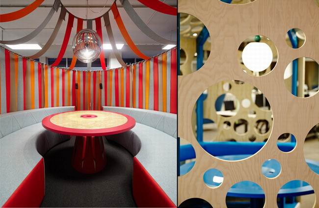 利用帕爾馬洛城的設(shè)計,設(shè)計師堅持選用風(fēng)格有些粗獷的材質(zhì),天花板上的通風(fēng)設(shè)備和管道也刻意裸露。員工和顧客可以通過家具的色彩辨識室內(nèi)的途徑,就像是在城市中行走一半,家具有一部分是藍(lán)色的,而另一部分則是黃色的。在辦公室的中心位置還設(shè)計幾個非常有創(chuàng)意的小型辦公室,為人們提供短暫交流的場所。