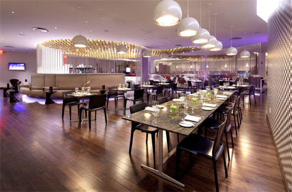 會(huì)所的平面圖呈云形,中央雞尾酒區(qū)四周是透明、彎曲的屏風(fēng),屏風(fēng)由不銹鋼管和胡桃木片組成。不銹鋼管和胡桃木片能夠調(diào)節(jié)視線,創(chuàng)造一個(gè)內(nèi)部的天際線。2000個(gè)粉飾圓筒懸掛在天花板上,營(yíng)造出一種熱情洋溢、雕刻般的形象。在這一中心裝飾元素下,客人有序地穿梭在雞尾酒區(qū),享受更多獨(dú)特的會(huì)所設(shè)施。