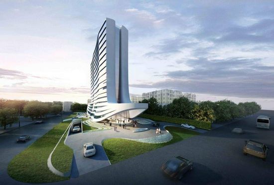 建筑外觀線條流暢,底層線條又有一種自然彎曲的感覺,使整個外觀看起來更加優(yōu)美、高雅和大方。酒店前三層設有大廳、宴會廳、會議室以及服務領域等空間。