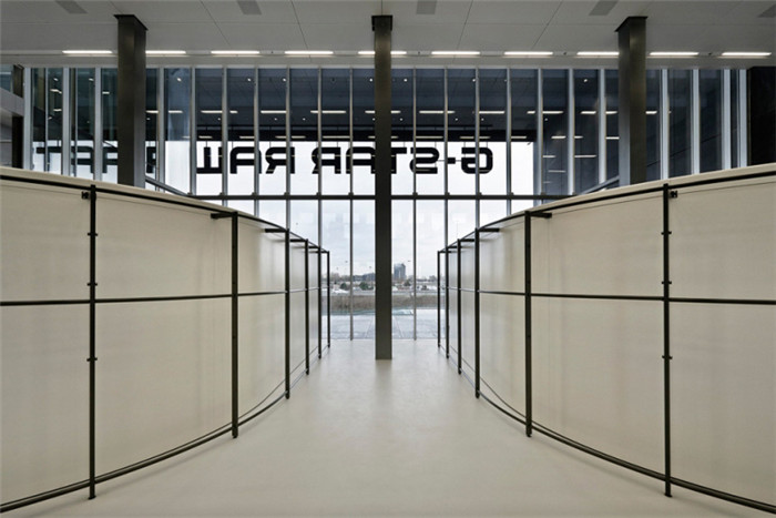 建筑外層包裹著一層黑色混凝土框架,而內(nèi)部則容納了承重設(shè)施。建筑入口位于展示G-Star創(chuàng)造產(chǎn)品的巨大的懸挑玻璃盒下方。建筑內(nèi)部高挑的空間方便各部門之間的相互交流、互動與協(xié)作。這是一個多功能的室內(nèi)空間,可以通過飛機庫式巨幅移門對外敞開,用于產(chǎn)品展示、露天派對或時尚時裝秀。