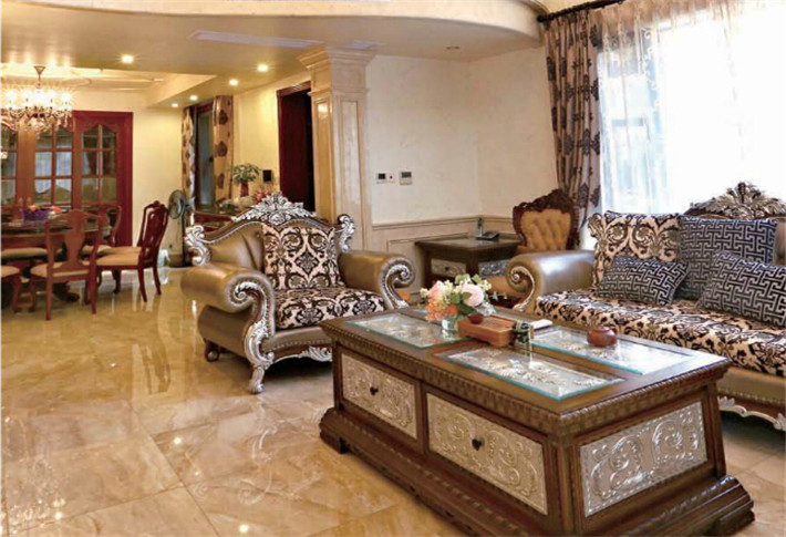 本案別墅的整體風(fēng)格為歐式風(fēng)格,設(shè)計師大量采用了立體的雕花設(shè)計,以塑造出式華麗高雅的視覺效果。大廳有歐式古典石材雕花的門廊,背最墻面則是上下成對的設(shè)計,客廳頂部的吊頂、二樓觀景臺的欄桿、家具的紋路都以呈妙延展的花枝點綴,妙筆生花的情境讓歐式的生活理念復(fù)活,釋放出源源不斷的活力。主臥綴以一盞纖長的水晶吊燈,則拉高空間的高度,使得環(huán)境沉穩(wěn)典雅。
