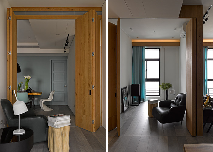 沉穩(wěn)的黑色系統(tǒng),結(jié)合了鞋柜、收納柜、書(shū)柜、電視柜,在內(nèi)斂穩(wěn)定之中,收藏起現(xiàn)代生活的現(xiàn)實(shí)面,看似一言以蔽之的黑色中,通過(guò)門片、壁紙間的材質(zhì)轉(zhuǎn)換,也能輕松刻劃出視覺(jué)外的新觸覺(jué)體驗(yàn)。