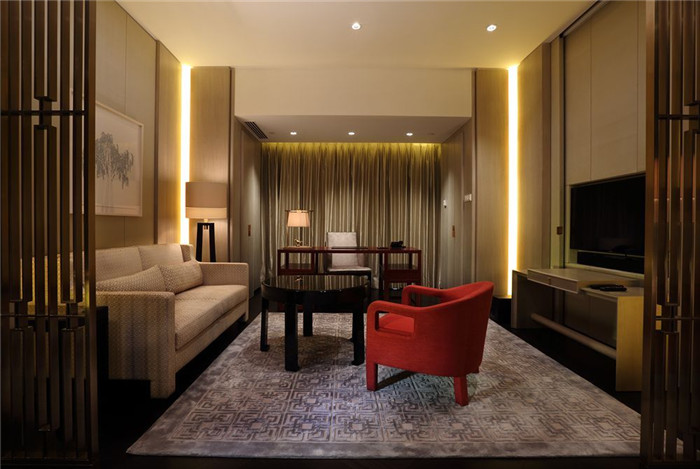 酒店大堂設(shè)計(jì)打破了廣而博的設(shè)定,取而代之的是橫、縱雙向的長(zhǎng)廊與內(nèi)斂的特質(zhì),其格局令人不禁聯(lián)想到“井”字。酒店客房設(shè)計(jì)別具品味。酒店主樓四到十二層包含豪華客房、豪華露臺(tái)房、貴賓客房、豪華套房等多種客房類型。不同類型的房間,在地上均采用了相對(duì)單一的人字形拼花地板,輔以格紋地毯,凸顯了酒店沉穩(wěn)內(nèi)斂的特質(zhì)。深邃的復(fù)古幾案與艷麗的布藝沙發(fā)相呼應(yīng),硬朗大氣中不乏優(yōu)雅的氣節(jié),呈現(xiàn)出一種與生俱來的高貴。
