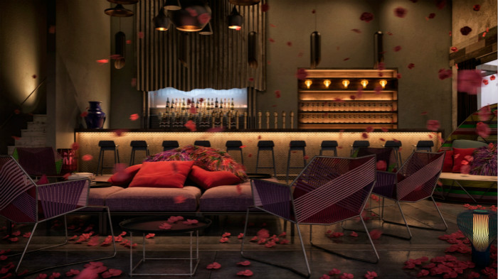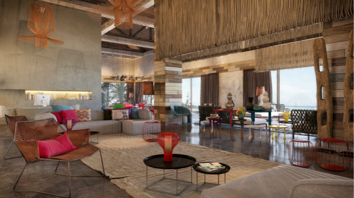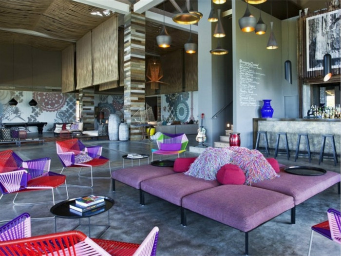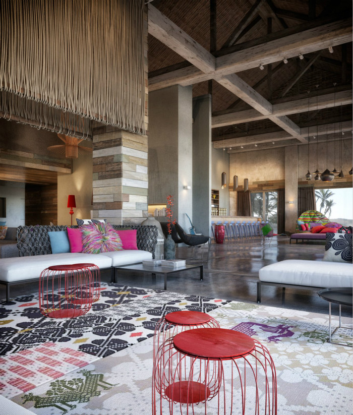 開放式的酒店大廳,色調(diào)鮮明靚麗,條紋紊亂有序,讓人感覺很是舒服。大廳的墻上有12張圖,這些藝術(shù)品的顏色是對(duì)大廳其余部分的沉思,展示在墊子、花瓶、家具和地毯上。薰衣草色、粉紅和紅色的陰影正好和地板的炭灰色形成了平衡。
