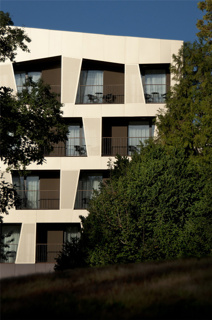 酒店外部的滑軌窗使用了金色的輕質復合鋁板,上面的圓孔使得從室內能夠看到外部的景觀,從外部卻很難看到室內,保護了室內的隱私。立面上的其他部分和屋頂都采用了預制混凝土墻板,有些可開啟的穿孔預制板設置在窗前,功能像是眼瞼一樣。整個建筑的設計使新建筑與原建筑形成了新的更復雜的空間對話。