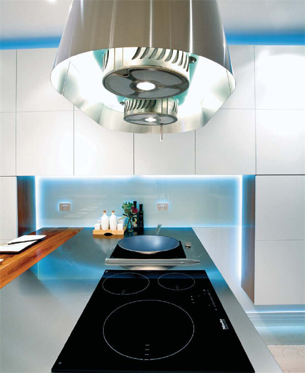 為了遵循傳統(tǒng)《瓦士圖·沙士塔》建筑理念及風(fēng)水學(xué)理論,感應(yīng)式灶臺的位置令業(yè)主們可以面向東方進行烹飪,另外還增加了LED照明燈圍繞在了漆面櫥柜的周邊。