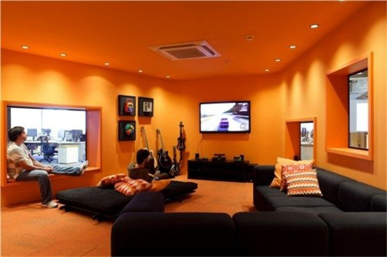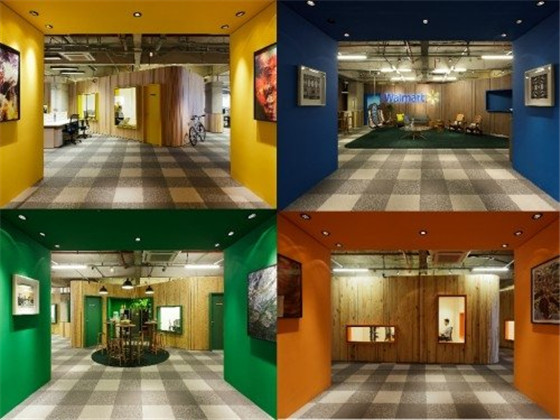 各個部門分布在不同的樓層,為了便于員工和訪客的確定區(qū)域,設計師每層的在中心地帶設計一個獨特的識別空間,打破空間垂直方向上的呆板。作為重要的空間組成,每層都有休息室和減壓空間。設計師希望通過這些休閑區(qū)域,增加不同員工部門的互動交流,為他們增加思維活力。為了確??臻g的連貫,休閑空間都有相似的設計語言,并分別選擇了沃爾瑪?shù)墓俜缴S色、綠色、藍色、橙色、作為每層的主打顏色。