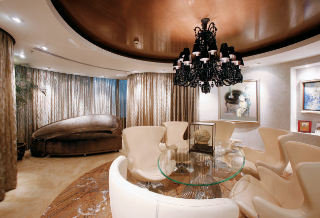 走道通往奢華的Mr.Leo辦公室,這是一個集合辦公、非正式會客和放松的場所。四周的墻體由意大利特制灰泥粉刷,圍繞著中間一張獨具匠心設計的玻璃會議桌,地面鋪設著與走道相同的花紋奇特的大理石,天花則是木膠合板拼接,懸掛著黑色水晶大吊燈。從窗戶往外觀望,可以欣賞到上海最好的繁榮美景。窗下定制的可組合沙發(fā)具備多項功能。另一邊,由窗簾分隔的是一個放松的區(qū)域和和私人使用的盥洗室。