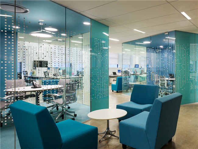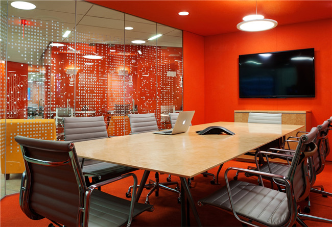 南北兩邊都是開(kāi)放式的辦公室設(shè)計(jì)區(qū)域,每個(gè)區(qū)域都有其特定的顏色,由多面的玻璃體塊構(gòu)成的框架,提供私人會(huì)議室和小型的對(duì)話亭??梢酝ㄟ^(guò)不同的路到達(dá)指定地點(diǎn),建立一些緊湊或者放松的空間。