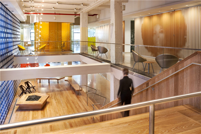文章導(dǎo)讀:潘多拉媒體公司的新辦公樓位于曼哈頓的市中心,由于它是全球知名的媒體集團(tuán),因此,在其辦公設(shè)計(jì)中,為了保證信息溝通的順暢,開(kāi)放式的辦公室設(shè)計(jì)顯得尤為重要。在中心區(qū)域設(shè)計(jì)師通過(guò)大臺(tái)階將兩層相連,并且充分利用兩層樓的高度,放置了一個(gè)用半透明的圓形碟片組成的大屏幕,藍(lán)色的窗簾布通過(guò)鋁制鉤子優(yōu)雅地布置著。這些元素結(jié)合起來(lái)創(chuàng)造一個(gè)模糊的概念,為了突出室內(nèi)巨大的感覺(jué)。用大型LED燈泡做成的大樹(shù)圖案十分吸引眼球。