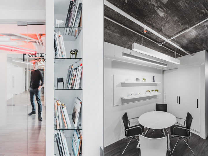 得益于辦公室之前的工業(yè)化風(fēng)格,設(shè)計師想在同樣的地方保持兩層樓的高度,特意裸露一些混凝土天花板,使其保持原有的結(jié)構(gòu),就像天花板上的紋理一樣。裸露部分增加了一部分工業(yè)化感覺,和辦公室其他部分的設(shè)計形成鮮明對比。