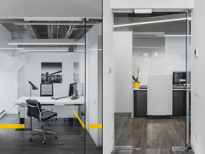 辦公室分為兩個部分,一是定量雙層高度的區(qū)域,而是為為建筑師設(shè)計的舒適空間。除了這兩個開放區(qū)域,一層還設(shè)有接待室、會議室和咖啡廳,二層有辦公室、休閑區(qū)、和開放會議室?;疑桶咨鞘覂?nèi)基礎(chǔ)色調(diào)。而明亮的黃色細節(jié)、獨角獸圖則在安靜的室內(nèi)背景下顯得十分突出。