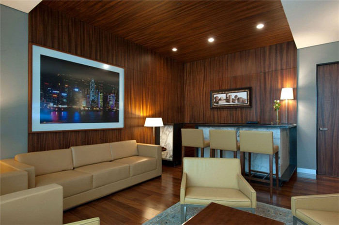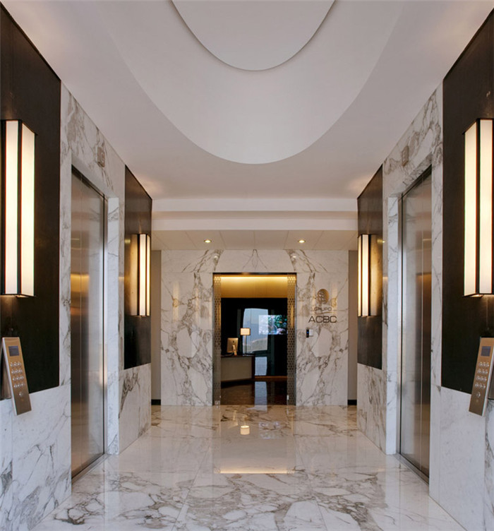 設(shè)計(jì)師將大理石、木材兩種不同質(zhì)地的自然材質(zhì)混搭在一起,形成鮮明的對(duì)比,再配以不銹鋼、鐵等材料,使室內(nèi)空間豐富多彩,別具創(chuàng)意。電梯使用了白色大理石,展現(xiàn)一種時(shí)尚、高貴和冷艷的質(zhì)感。