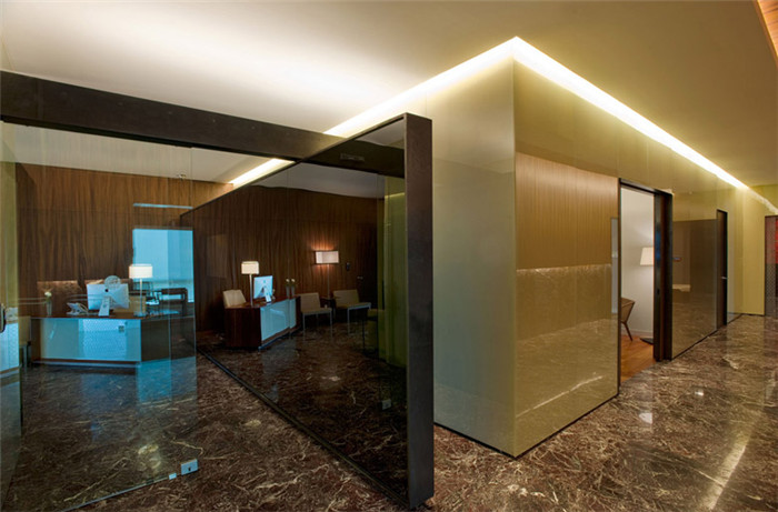 設(shè)計(jì)師通過(guò)多層次的設(shè)計(jì)構(gòu)造,巧妙運(yùn)用設(shè)計(jì)風(fēng)格與材料,將走廊設(shè)計(jì)的很少簡(jiǎn)練大方。而走廊的盡端是由幾何紋樣裝飾玻璃隔開(kāi)的行政秘書(shū)區(qū)域,墻壁上飾有藝術(shù)家的畫(huà)作。休息室內(nèi),獨(dú)立的黑色金屬吧配以典雅的大花白石板材,盡顯時(shí)尚高雅。