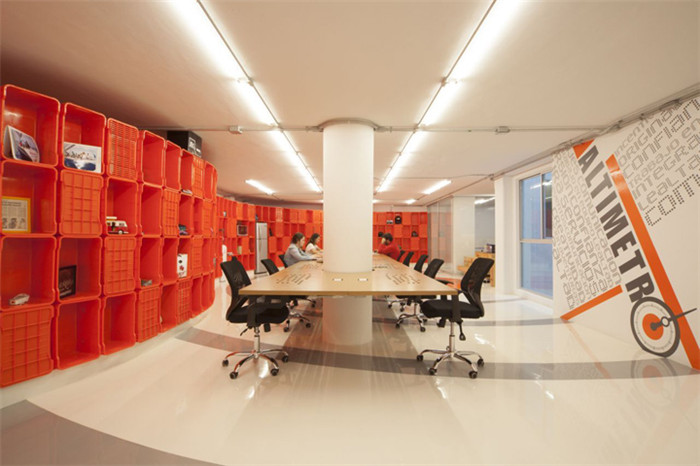 室內(nèi)最引人注目的是那一道長15米的橙色塑料盒子隔墻,蜿蜒的曲線界定了工作空間與儲藏空間,而其自身也好比一個(gè)超大的收納柜用以儲藏文檔或辦公用品。塑料盒子根據(jù)需要設(shè)計(jì)成正反方向自由排列,滿足內(nèi)外需求。