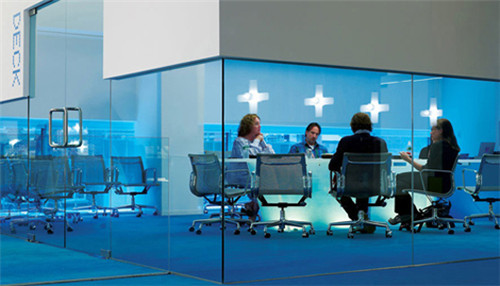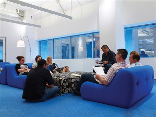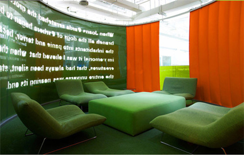 總裁室和財(cái)務(wù)總監(jiān)辦公室旁邊的每一片辦公空間都是開敞式的布局,各個(gè)區(qū)域由不同的色彩區(qū)分開來。每個(gè)空間都有鮮明的個(gè)性和與眾不同的名稱,充滿獨(dú)特的活力。設(shè)計(jì)師在這里增加了“樹屋”——可以通過樓梯和坡道到達(dá)的中層樓會(huì)議室組群。樓板上還開了洞,形成兩個(gè)中庭。平臺(tái)上擺放著酸性橙色的座椅,絕對(duì)是時(shí)尚人士的聚會(huì)場(chǎng)所。這是一個(gè)很有特色的辦公空間設(shè)計(jì)典范。