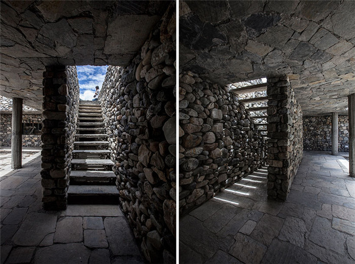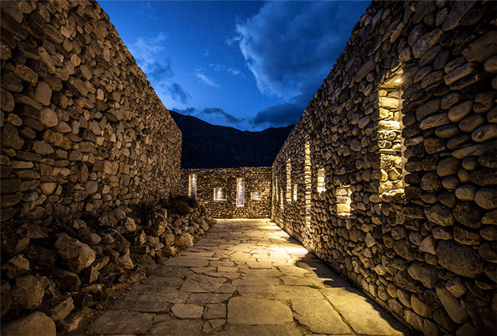 石材的自然性能決定了其大量被使用與本次特色設(shè)計之中。所有房間的石頭都不一樣,各有特色,尤其是墻壁和天花板部位,并通過天窗采光。該結(jié)構(gòu)的中心,正好處于最大庭院的中間部位,衛(wèi)星臺作為最高標(biāo)志物,整個石頭廣場飄揚(yáng)著祈禱的旗幟。
