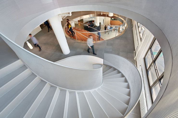 辦公室最引人注意的就是連接六層和七層的樓梯。圓形造型的樓梯用胡桃木版鋪設(shè)而成,其造型像一枚“錢幣”。連接7層和8層樓梯采用白色金屬的螺旋樓梯貫穿上下兩層。