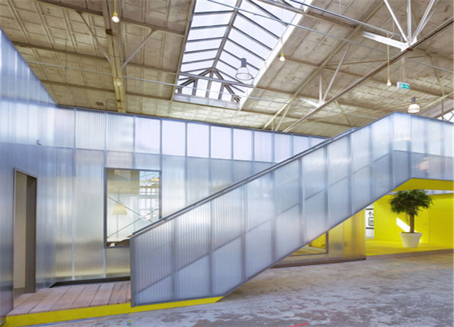 空間中的橋梁、過道和樓梯調(diào)節(jié)了空間的張弛尺度,也豐富了結(jié)構(gòu)的表達(dá)。兩個中庭大廳,成為各個功能區(qū)重要的功能補充,既是訪客等待區(qū)和員工的餐區(qū).也可以進(jìn)行非正式的磋商會議、企業(yè)內(nèi)部講座和展覽等。設(shè)計師還根據(jù)馬斯河景觀,在中庭還設(shè)立了“野餐區(qū)”。