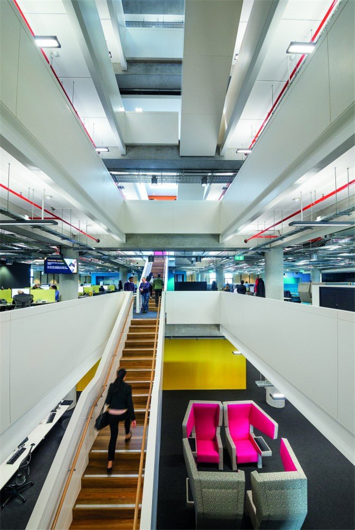 建筑頂部設(shè)有采光筒和光反射器,可以將陽光反射到建筑深處。而北立面則設(shè)計成遮光幕墻,這種設(shè)計參考了一種新西蘭本土樹木(Pohutukawa)葉子形態(tài),形成了一個別具特色的遮陽層。辦公室內(nèi)部個性鮮明、空間共享、透明管理,這一切都在激發(fā)著員工的工作熱情。