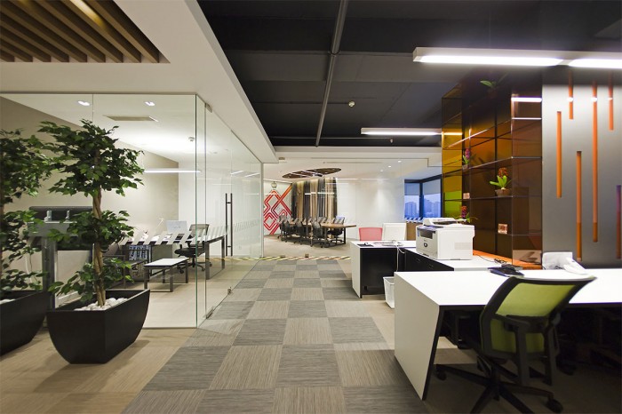 辦公空間入口接待區(qū)色彩比較明亮,讓人一走進(jìn)去就有一種豁然開朗的感覺、也頓時充滿了工作的活力。開放區(qū)域設(shè)有別致的座椅,賦以各樣色彩,使工作氛圍頓時輕松起來。透過透明玻璃,員工還可以欣賞到室外的風(fēng)景,室內(nèi)與室外就這樣連接起來,使整個室內(nèi)空間設(shè)計更加寬敞、明朗起來。