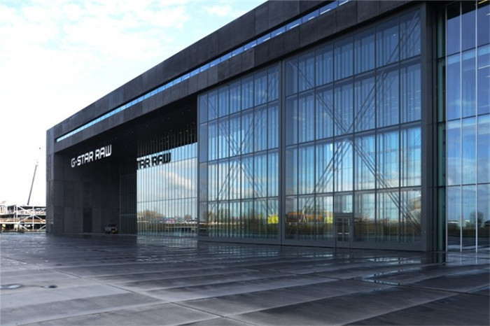 建筑外層包裹著一層黑色混凝土框架,而內(nèi)部則容納了承重設(shè)施。建筑入口位于展示G-Star創(chuàng)造產(chǎn)品的巨大的懸挑玻璃盒下方。建筑內(nèi)部高挑的空間方便各部門之間的相互交流、互動與協(xié)作。這是一個多功能的室內(nèi)空間,可以通過飛機庫式巨幅移門對外敞開,用于產(chǎn)品展示、露天派對或時尚時裝秀。
