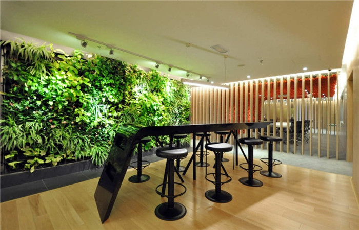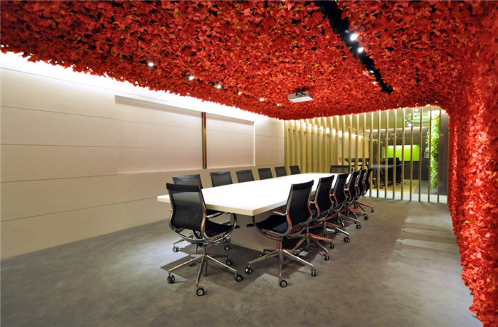 辦公室內(nèi),處處都可以看見自然元素。比如別具創(chuàng)意的會(huì)議室,這里最大的特色莫過(guò)于滿目鮮艷欲滴的紅色花卉;而小型會(huì)議室則以蝴蝶為設(shè)計(jì)主題,疏密的布局令空間充滿動(dòng)感;茶水休閑區(qū)綠色盎然的植物層疊覆滿整個(gè)墻面,整個(gè)辦公空間,都是自然的氣息。