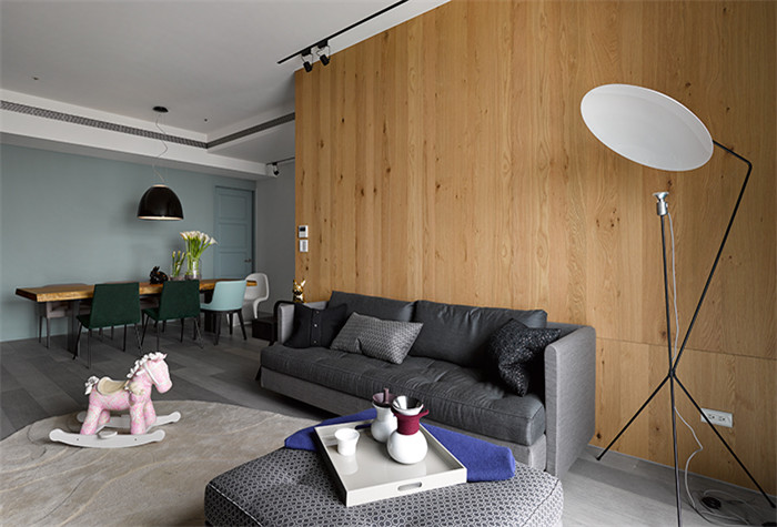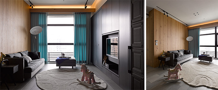 沉穩(wěn)的黑色系統(tǒng),結(jié)合了鞋柜、收納柜、書(shū)柜、電視柜,在內(nèi)斂穩(wěn)定之中,收藏起現(xiàn)代生活的現(xiàn)實(shí)面,看似一言以蔽之的黑色中,通過(guò)門片、壁紙間的材質(zhì)轉(zhuǎn)換,也能輕松刻劃出視覺(jué)外的新觸覺(jué)體驗(yàn)。